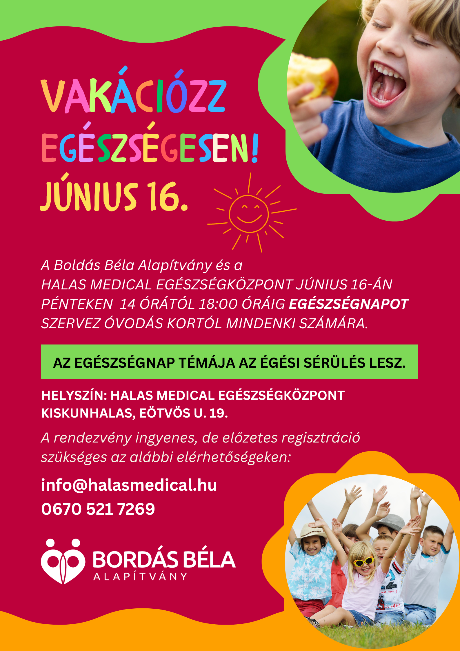 Halas Medical Egészségközpont június 16-án pénteken 14 órától 18:00 óráig egészségnapot szervez óvodás kortól mindenki számára. Az egészségnap témája az égési sérülés lesz. Helyszín: Halas Medical egészségközpont Kiskunhalas, Eötvös u. 19.
